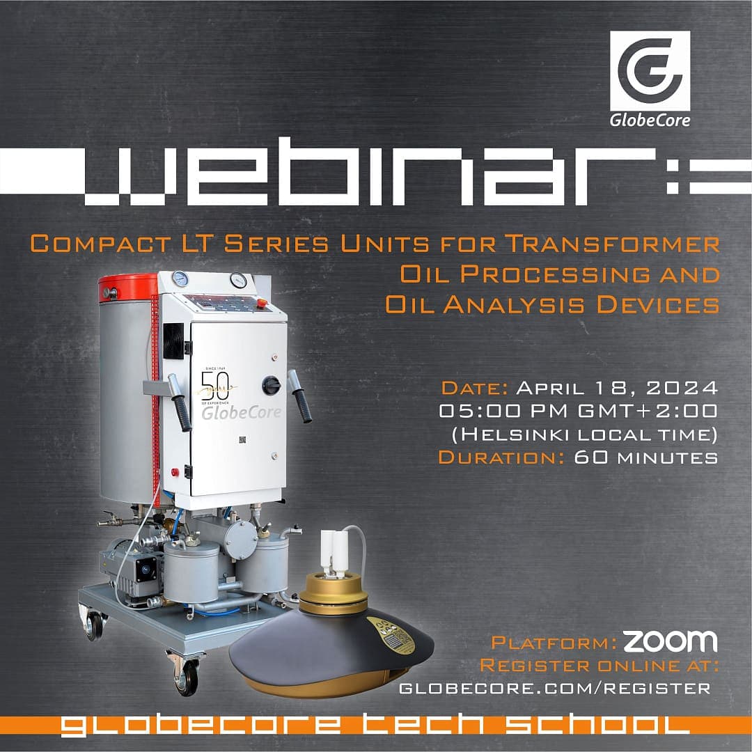 GlobeCore, within the educational platform GlobeCore Tech School, is hosting an online webinar dedicated to compact LT series equipment for transformer oil processing. The webinar will be held in two language versions — English and Spanish — enabling the participation of a broader international audience of professionals. Dates and Time: Wednesday, January 14, 2026, 4:00Read More