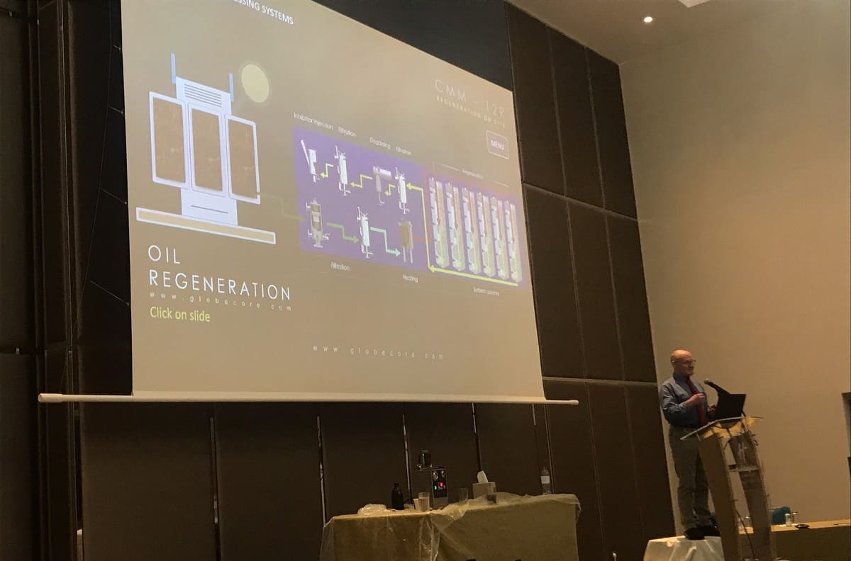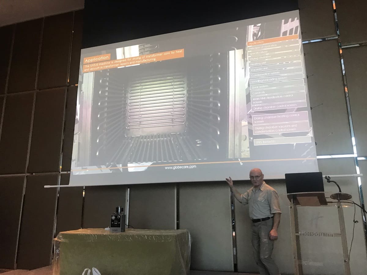 GlobeCore Service-Ingenieur Frank May präsentierte den Teilnehmern die neuesten Technologien und Geräte zur Verbesserung der Zuverlässigkeit und Lebensdauer von Transformatoren, z.B. Ölreinigungs- und Regenerationsgeräte sowie Isolationstrocknungsanlagen. Neben Frank May hielten auch Vertreter von Vaisala und der Maschinenfabrik Reinhausen ihre Präsentationen. Diese konzentrierten sich auf die Bedeutung der Auswahl von Transformatorenöl und Transformatorkomponenten-Diagnosegeräten (z.B. Analyse von gelöstem Gas).