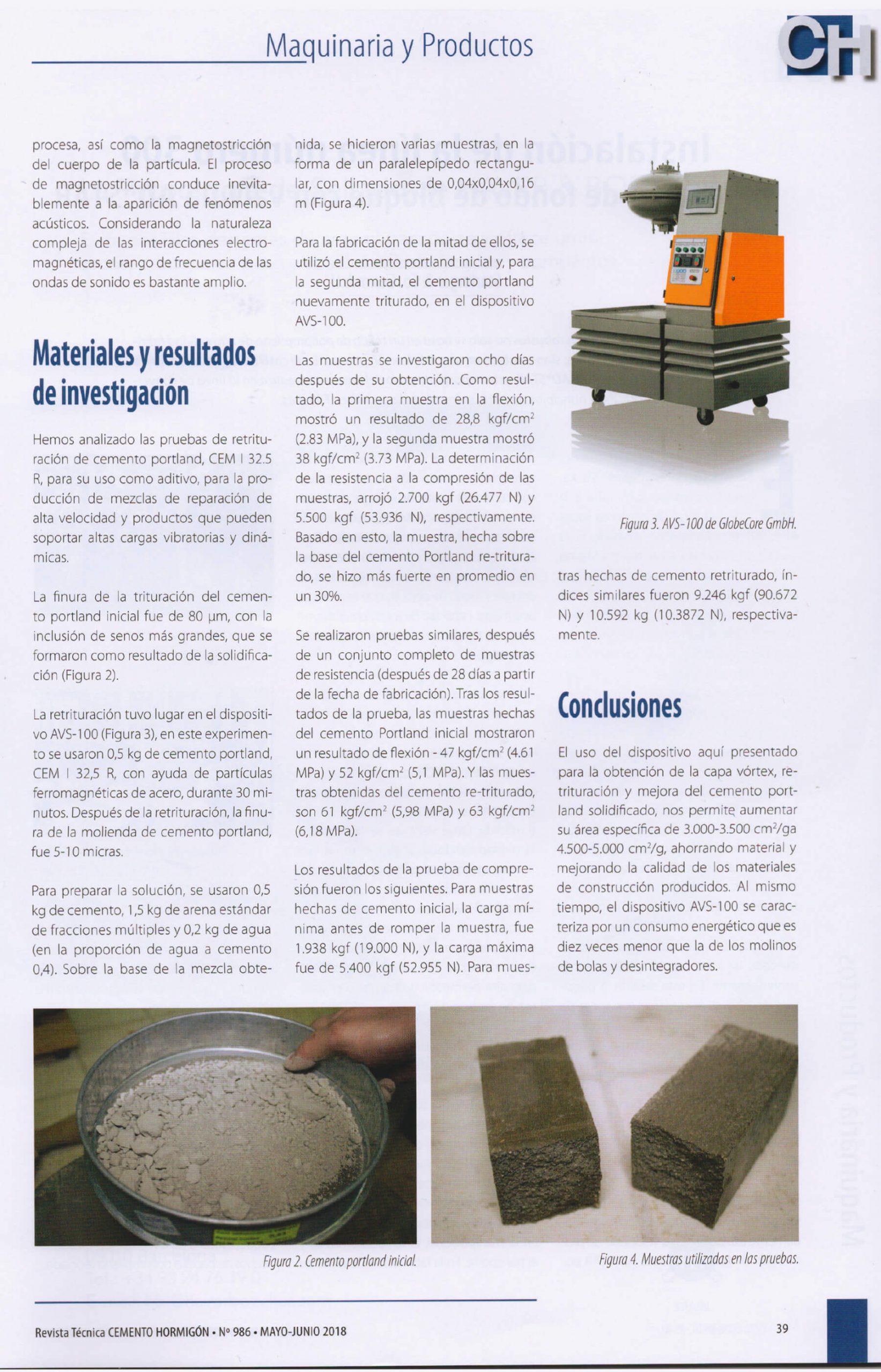 Die Mai-Juni-Ausgabe 2018 des spanischen Cemento Hormigón Magazine enthält einen Artikel von José Mora, einem Elektroingenieur von GlobeCore, mit dem Titel „Nachschleifen und Verbessern von Portlandzement in den Wirbelschichtsystemen aus ferromagnetischen Partikeln“.