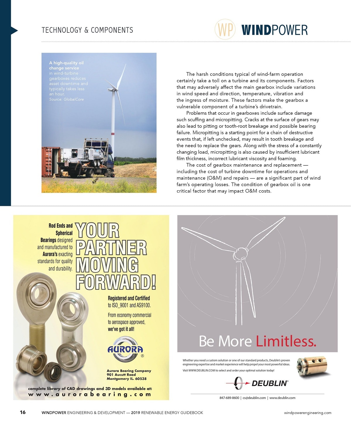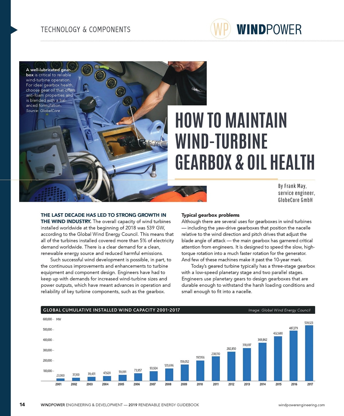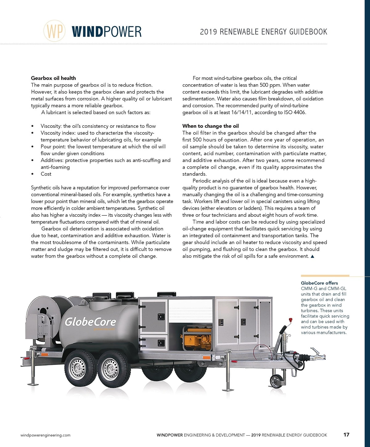 En la edición de diciembre de 2018 de «Windpower Engineering & Development», se publicó un artículo titulado «How to maintain wind-turbine gearbox & oil health», escrito por el ingeniero de servicio de GlobeCore Frank May.