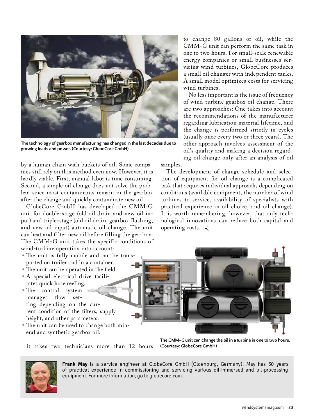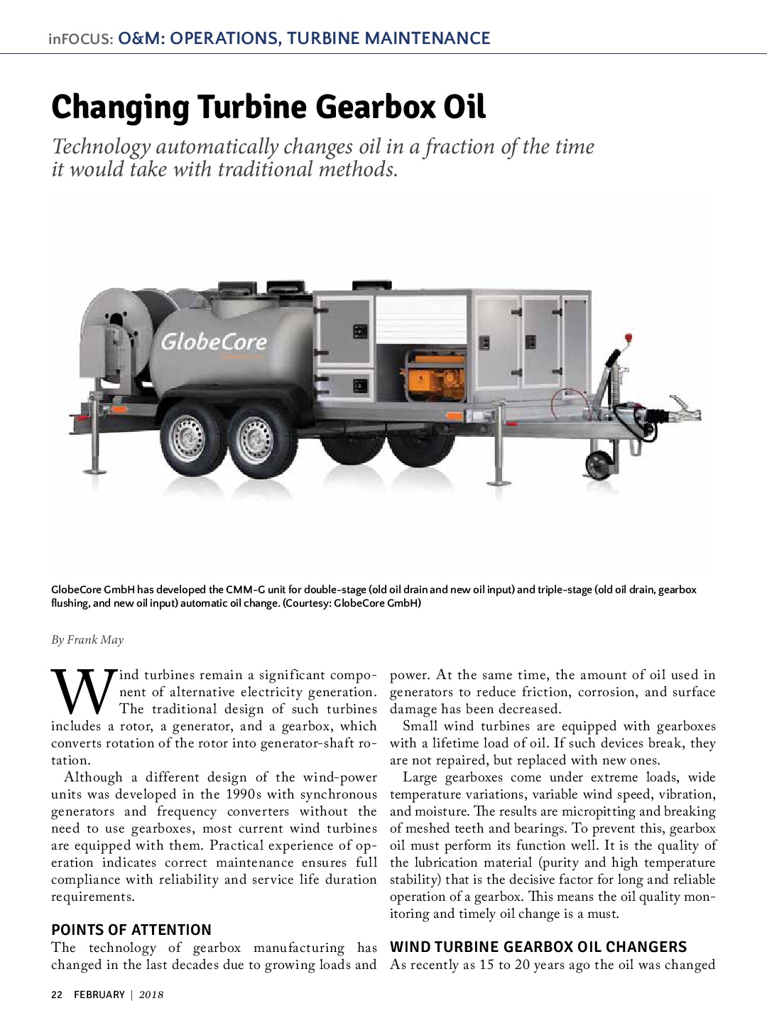 En la revista se discutan los puntos principales, a los que se debe prestar atención al reparación de las cajas de engranajes de los generadores eólicos y los cambios del aceite. Se describen las características de la operación y las ventajas de la instalación del tipo CMM-G producido por GlobeCore, utilizado para resolver estos problemas.