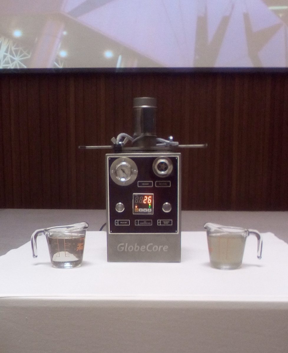 En la presentación, nuestros gerentes hablaron sobre el dispositivo y el principio de operación de las instalaciones de GlobeCore, y demostraron el proceso de purificación de aceite en una muestra de laboratorio del tipo СMM. Después del procesamiento, la muestra de aceite contaminado se hizo notablemente más ligera y más limpia.