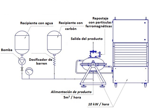 Como puede verse en la figura, la productividad de la línea tecnológica en el caudal es de 5 m3 / h, y el consumo energético de un aparato de la capa vórtex AVS-150 es de 10 kW, es decir, el consumo energético específico molino electromagnético será de solo 2 kWh / m3, que es decenas de veces menos que los molinos de bolas y barras.