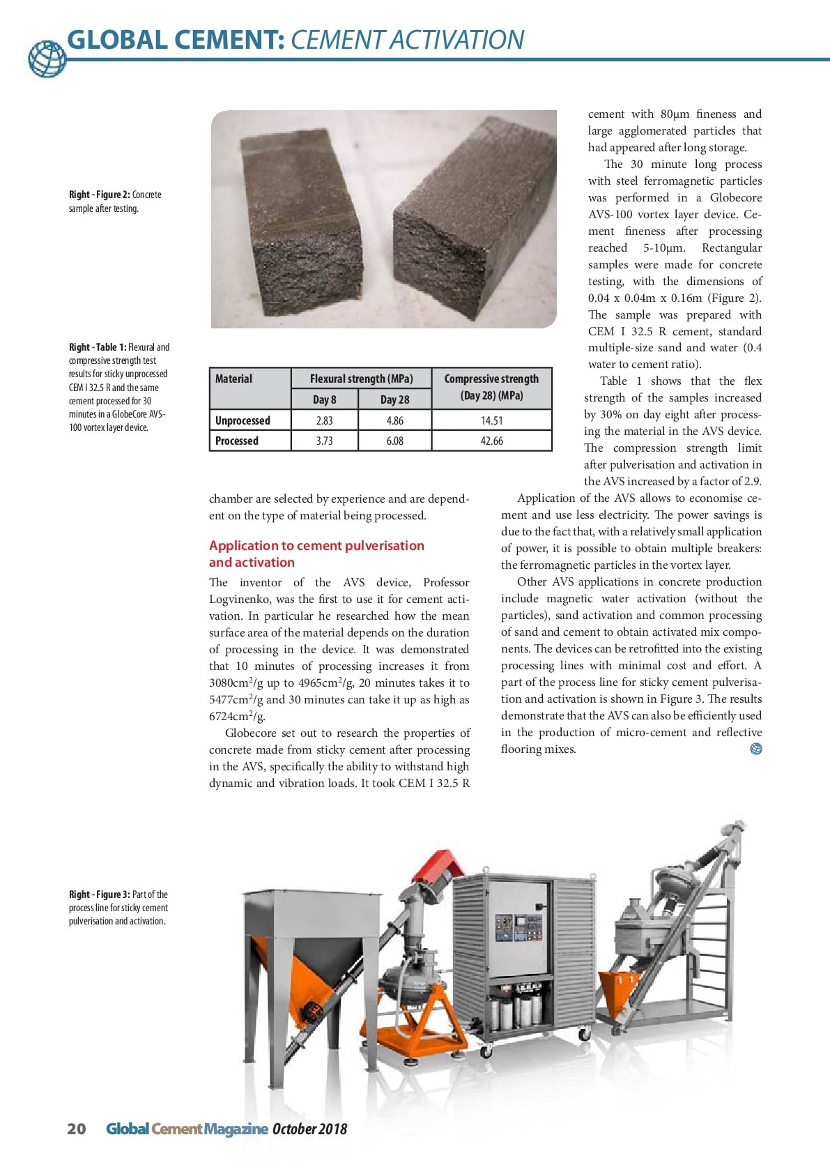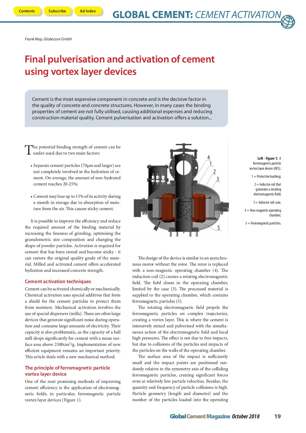 Le numéro d’octobre du magazine Global Cement a publié un article de Frank May, ingénieur de service chez GlobeCore, intitulé «Broyage supplémentaire et activation de ciments dans les appareils à couche vortex par particules ferromagnétiques».