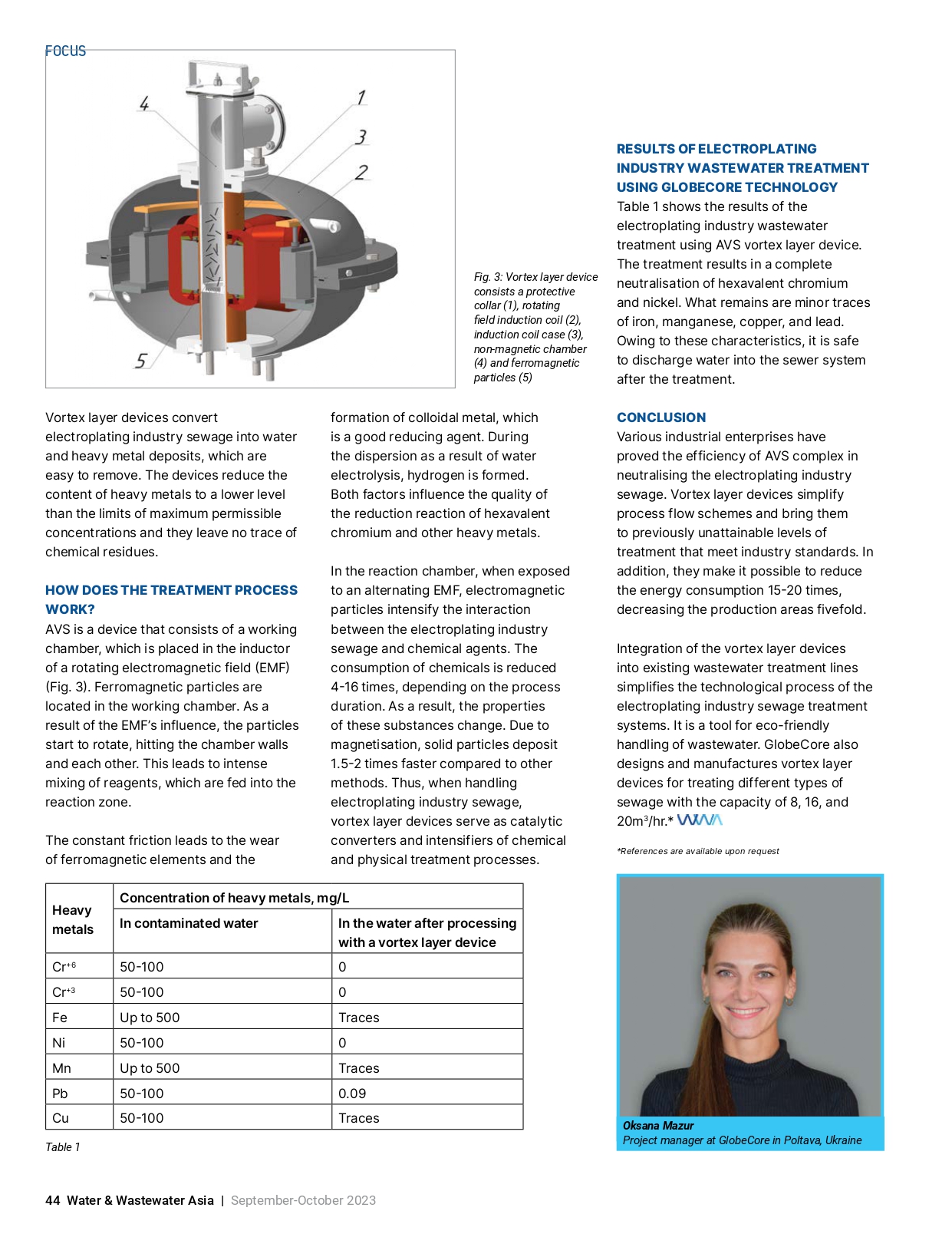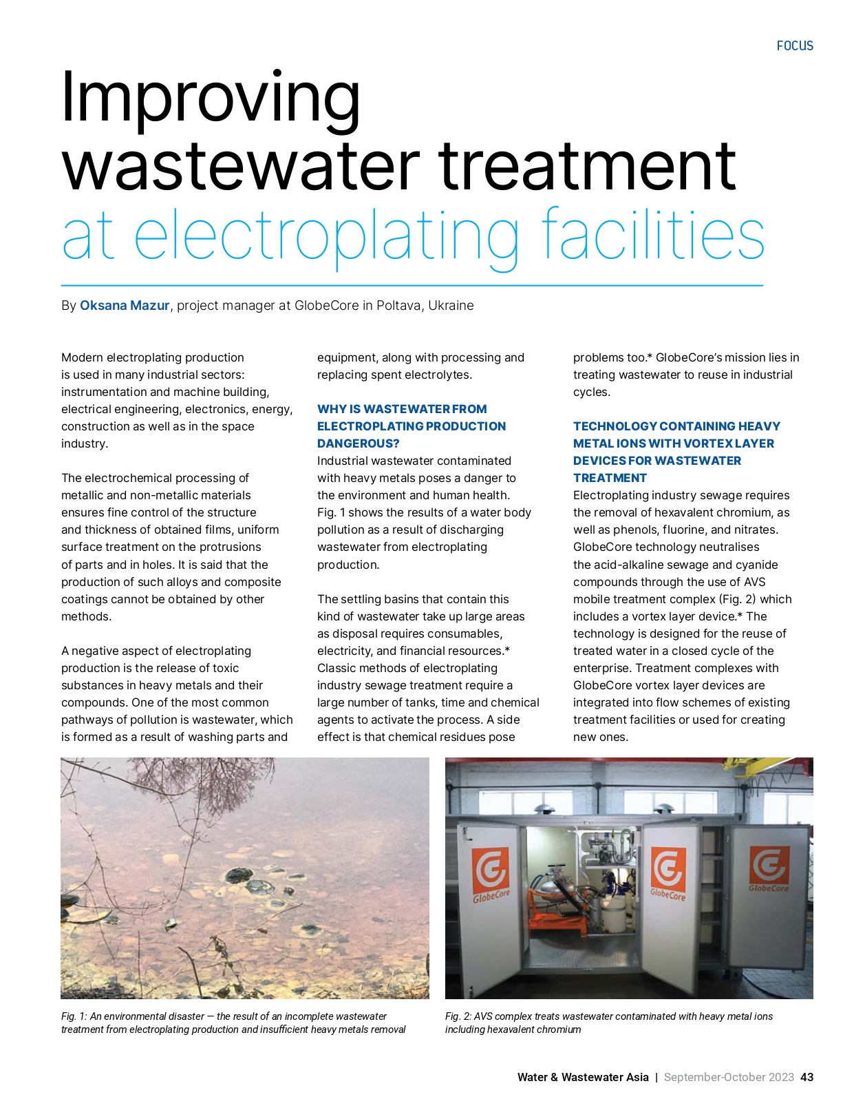 Mettant l’accent sur le traitement des eaux usées, le magazine a présenté un article d’Oksana Mazur, Chef de Projet chez GlobeCore. La publication «Amélioration du traitement des eaux usées dans les industries de galvanoplastie» discute des avancées de l’entreprise dans ce domaine.
