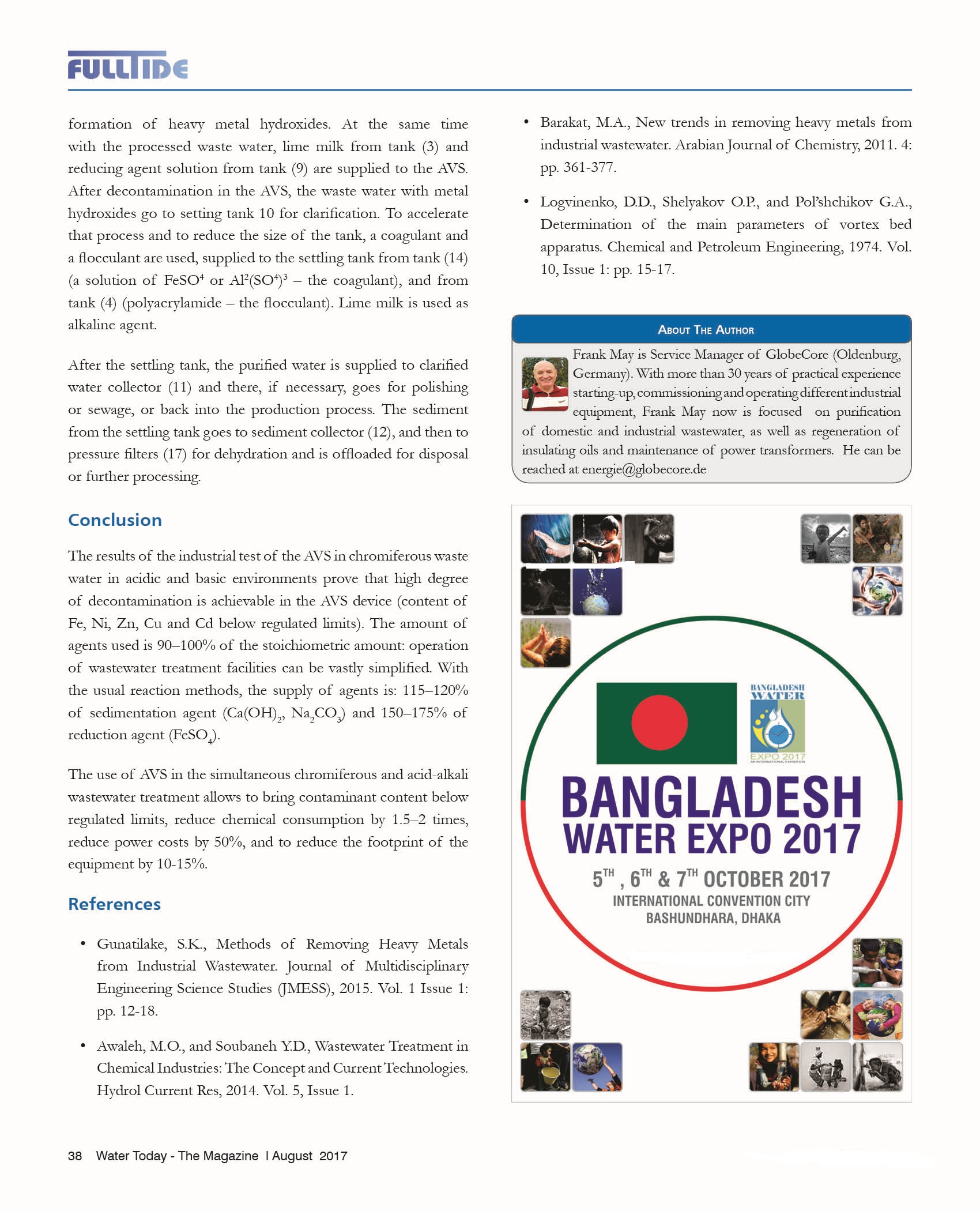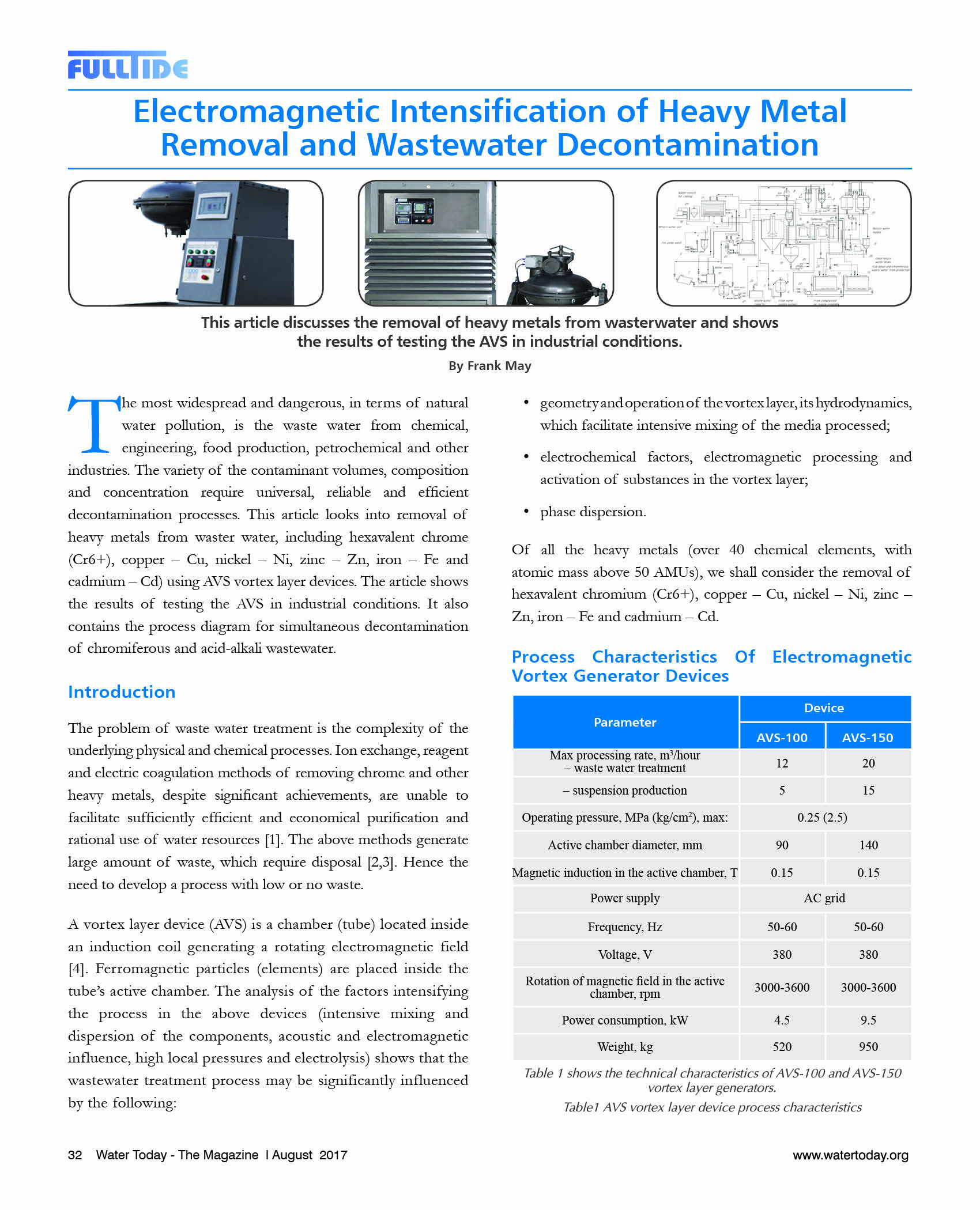 Le huitième numéro du magazine « Water today » de cette année, 2017, a publié un article “Electromagnetic Intensification of Heavy Metal Removal and Wastewater Decontamination” (Intensification électromagnétique d’enlèvement des métaux lourds et la décontamination des eaux usées).