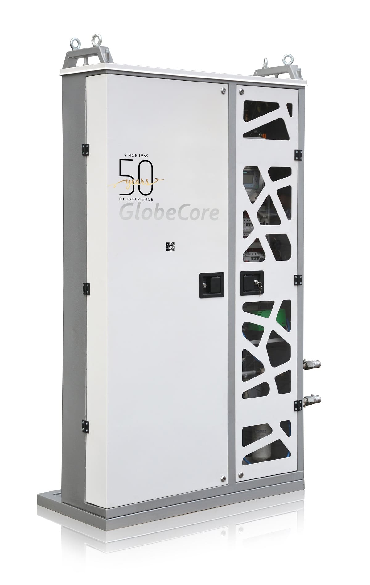 システムは変圧器に接続して、常に近くにある。接続した後、閉循環ループが現れる:オイルは変圧器タンクの下部からTOR-5システムの検出器を通して変圧器タンクの上部へ戻る。検出器は周波数1分に一回で変圧器油のパラメーターを測って、クラウド・サービスへ送って、GlobeCore方法論で変圧器状態を徹底的に評価できるように他のパラメーターも計算する。