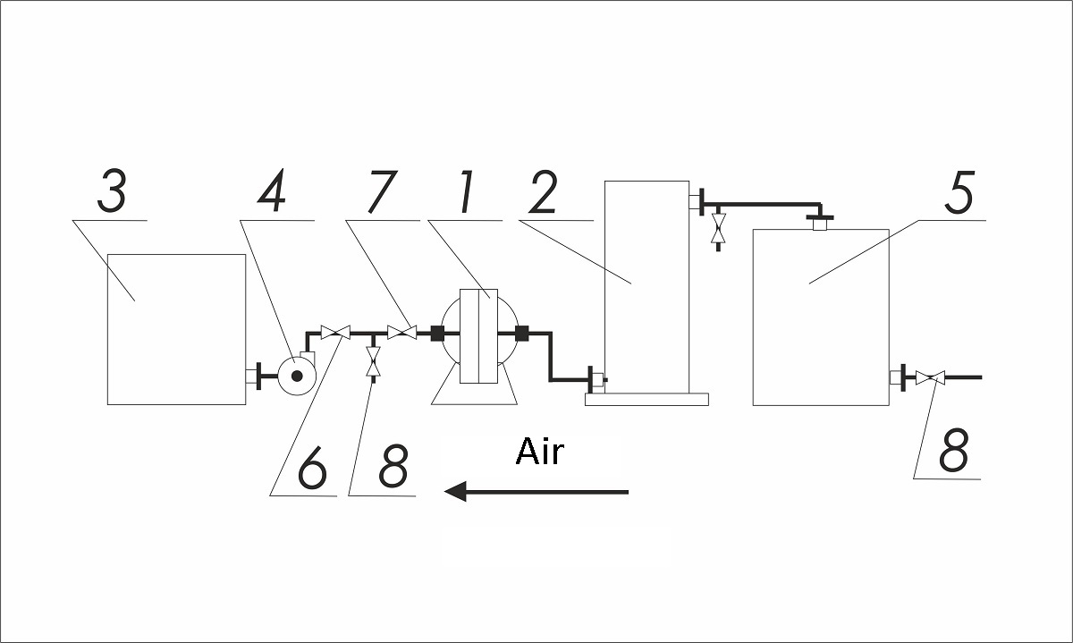 Figure 1 – Process flow diagram of a post-yeast wash decontamination unit: 1 — vortex layer device, 2 — mass transfer column, 3 — source wash tank, 4 — pump, 5 — decontaminated wash tank, 6 — shutoff valve, 7 — control valve, 8 — samplers