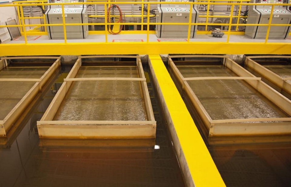 Most of the cyanide-containing water is purified in cyclic purification units, where the water is treated by the reagents in reservoirs. Larger amounts of waste water are processed in continuous devices.