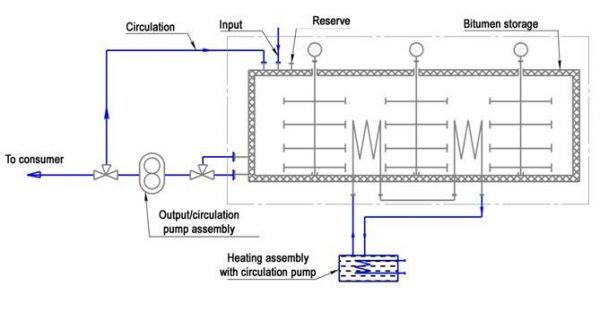 A horizontal insulated vessel pos. 1, made of structural-grade steel, with heat carrier circulation system pos.5. In the lower part of the tank is an output connector pos.12, through which bitumen is discharged to consumers, and a drain connector pos. 13.