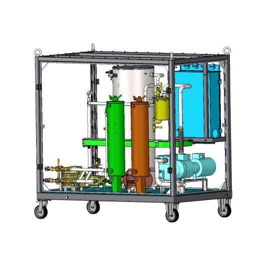 The CMM-4,0T Turbine Oil Filtration System can be used for such processes as purification, dehydration4The aim of crude oil dehydration is to remove free water from the oil and then to break the oil emulsions to reduce the remaining emulsified water in the oil. and degassing5Oil degassing is the process of removing undesirable solved gases from the oil (separately or all together).. Evacuation is also possible.