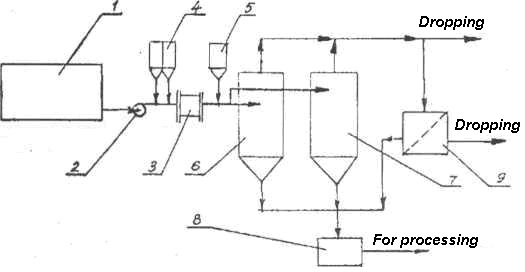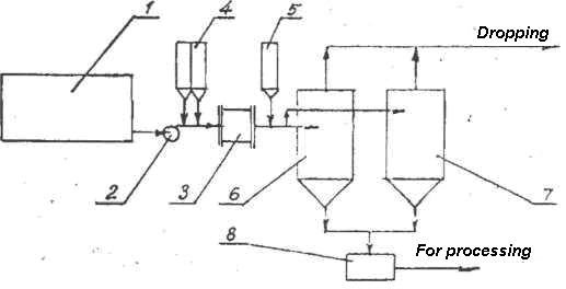 Fig. 153. Flow sheet of neutralization and cleaning of mine waters: 1 – Receiving tank; 2 – Pump; 3 – AVS; 4, 5 – Tanks for additives; 6.7 – Active sedimentation tanks; 8 – Sludge collection tank
