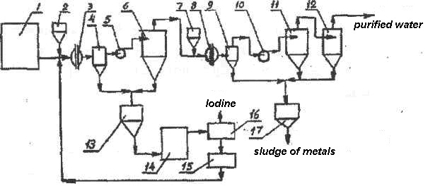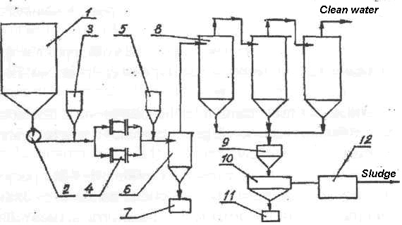 Fig. 150. Flow sheet of neutralization and utilization of produced water from drill holes. 1 – Stabilization tank 2 – Pump; 3, 5 – Containers for additives; 6 – Intermediate tank; 7.9 – Collection tanks; 8-active sedimentation tank; 10 – Hydro separator; 11 – Collector of metals; 12 – Accumulator of compounds of metals