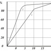Fig. 2. Dependency of efficient clarification of waste water in settling tanks after formation of metal hydroxide: 1 – mechanical agitator reactor; 2 – AVS