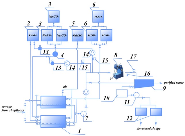 Figure. 4 Process diagram for simultaneous purification of chrome and acid/alkali containing waste water: 1- mixing tank; 2 — reduction agent tank (FeSO4 solution); 3 —Na2CO3 solution preparation tank; 4,7,11 — pumps; 5 — reduction agent tank; 6 — sulfuric acid tank; 8 — AVS; 9, 10 — settling tank; 12 — vacuum filter; 13 — portioning; 14 — flow meter; 15 — reagent consumption regulation valve; 16 — sampling; 17 — pH-meter