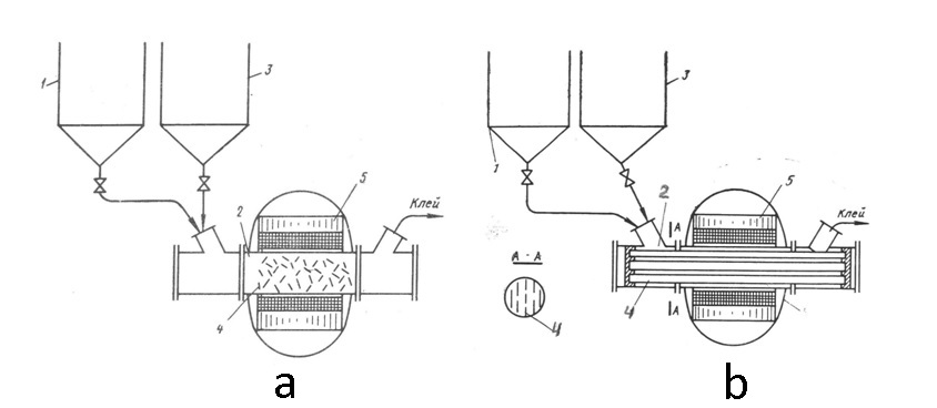Figure 1 – Schematic diagram for obtaining a resin glue emulsion: а) AVS and b) electromagnetic device with a plate vibrator: 1 – melter, 2 – operating chamber of electromagnetic device, 3 – tank for СаСО3 solution, 4 – ferromagnetic particles, 5 – electromagnetic field inductor